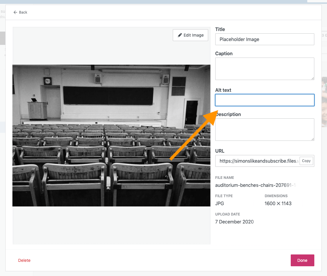 This process applies whenever you upload a new image, but what about adding alternative text to images you've already uploaded, or came with the theme; what about editing existing alternative text?