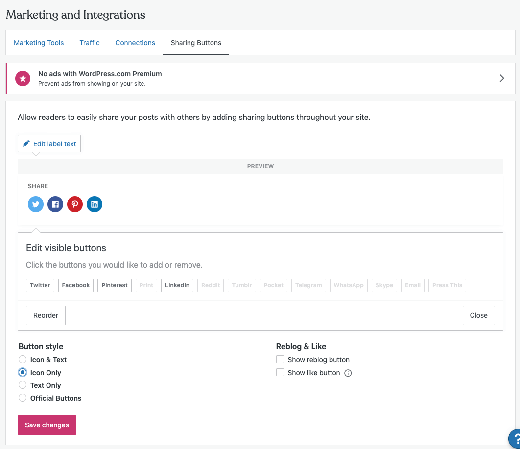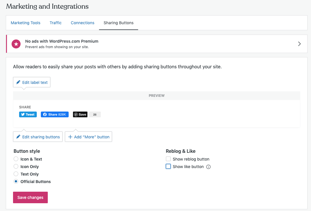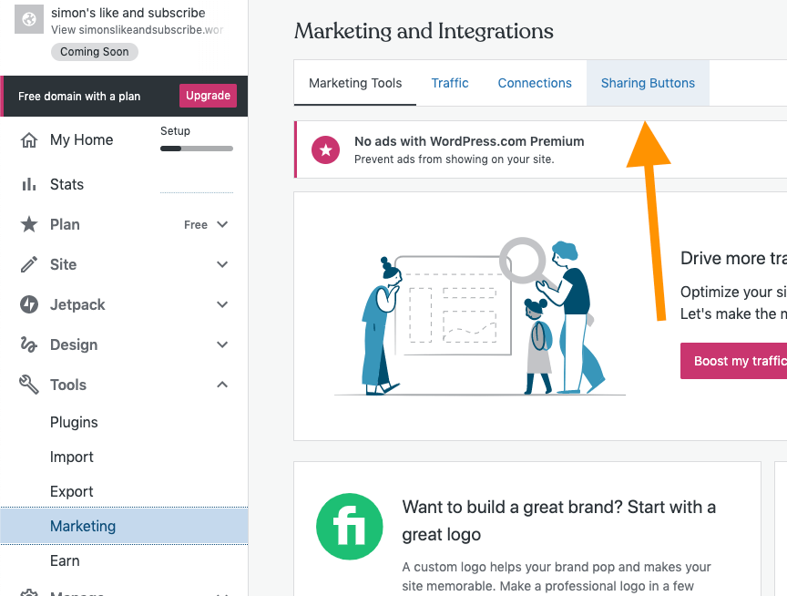 To access these settings, go to Tools > Marketing from the dashboard, and then click on the Sharing Buttons tab on the top.